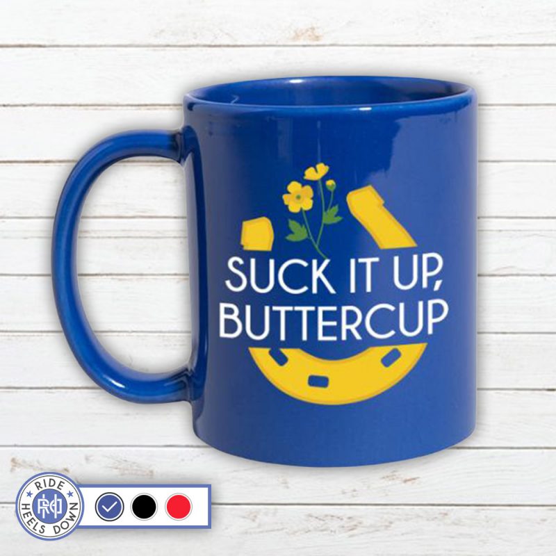 Add a splash of fun to your coffee, tea, or hot chocolate! These pretty blue 11 oz. ceramic mugs have our fun SUCK IT UP, BUTTERCUP design on one side and the Ride Heels Down logo on the other.