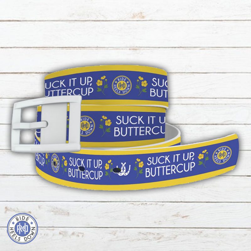 Features our “Suck It Up, Buttercup” image on one side, the Ride Heels Down logo on the other, and is available in 3 fun colors!