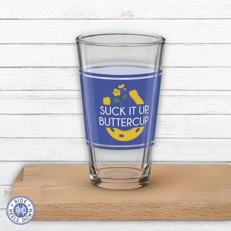 Tough day? Bad ride? Suck it up, buttercup! ;) Pretty and fun, you’ll love how our “Suck it Up, Buttercup” 16 oz pint glass pairs with our matching wristband and boot socks!